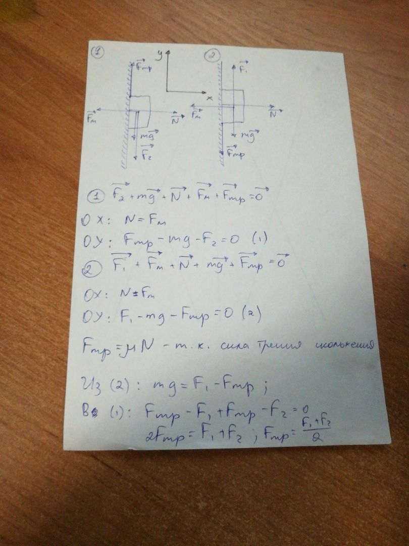 К вертикальной железной стене "прилипла" намагниченная шайба. К шайбе привязана легкая нить, за которую тянут так, что нить остается параллельной стене. Чтобы перемещать шайбу с по- стоянной скоростью по стене вертикально вверх нужно тянуть за нить с силой F1, чтобы переме- щать шайбу с постоянной скоростью вертикально вниз – с силой F2. а) Найдите силу трения скольжения Fтр, действующую на шайбу. б) С какой силой F нужно тянуть шайбу за нить, чтобы она перемещалась с постоянной скоростью по стене в горизонтальном направлении?