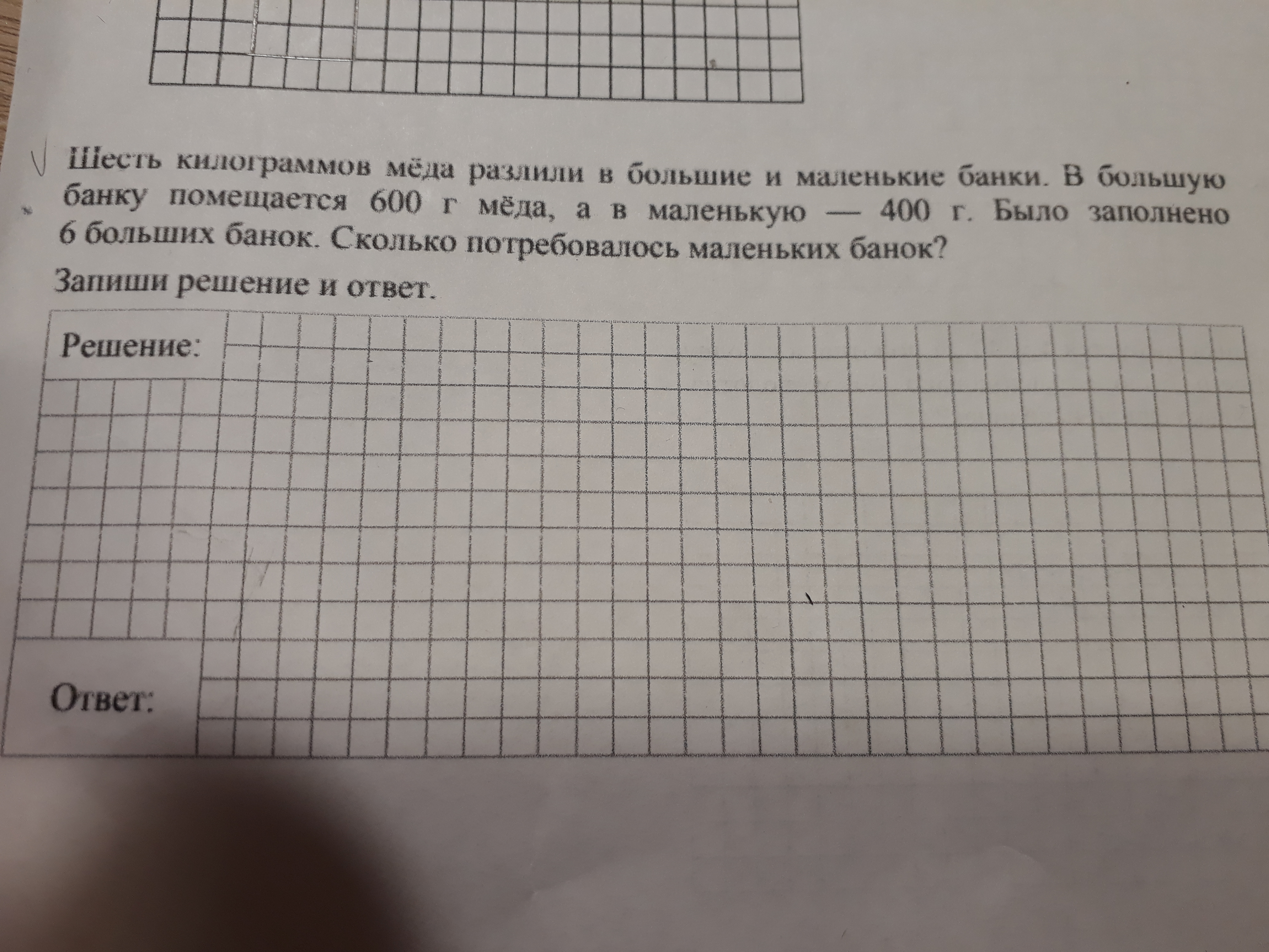 Всего 6 килограмм мёда. В большую помещается 600 грамм, а в маленькую 400. Было заполнено шесть больших банок. 6*600=3600 ГРАММ. А значит маленьких баночек осталось 2400/400=6 банок.