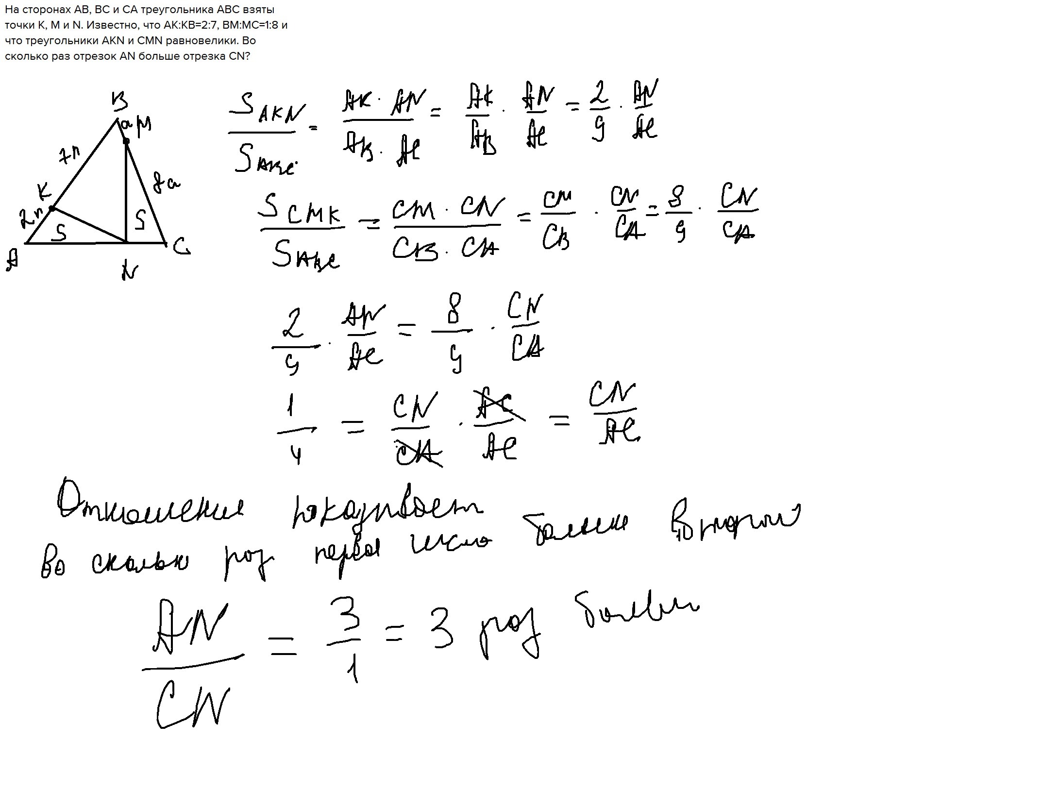 На сторонах AB, BC и CA треугольника ABC взяты точки К, M и N. Известно, что AK:KB=2:7, BM:MC=1:8 и что треугольники AKN и CMN равновелики. Во сколько раз отрезок АN больше отрезка СN?