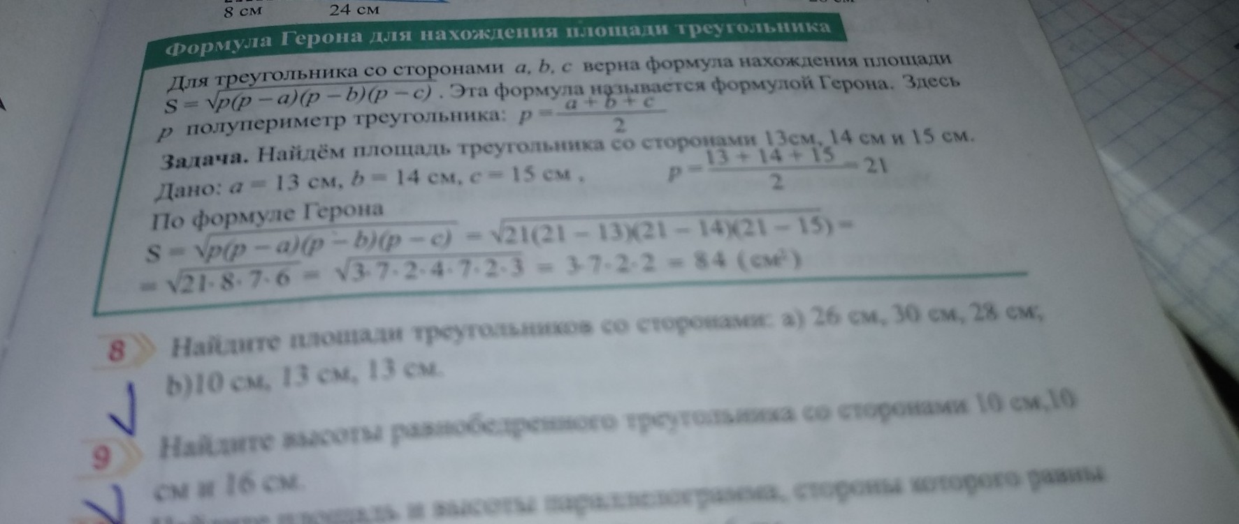 8.а Дано: a=26, b=30,c=28. Найти: S=? - площадь.
