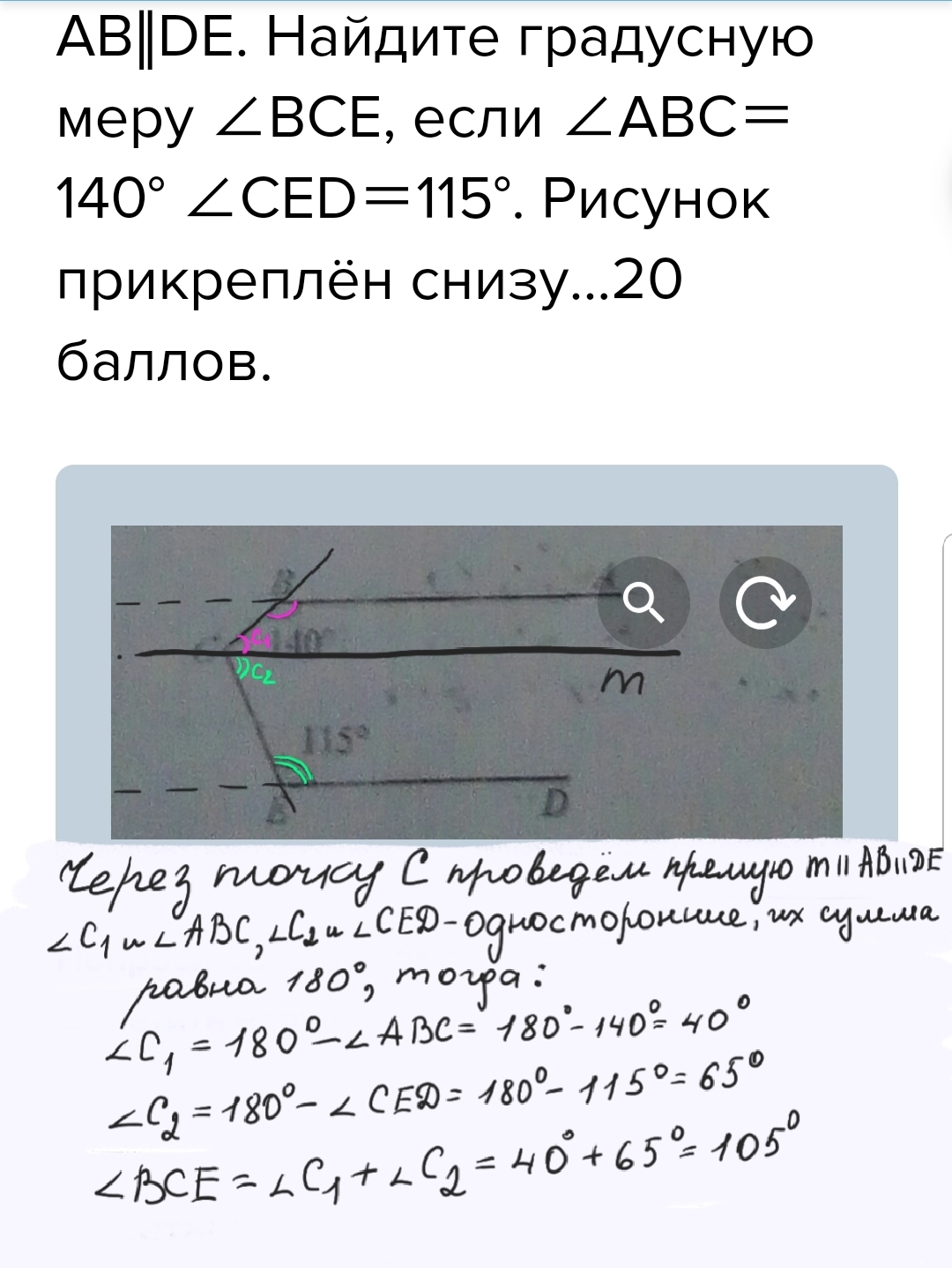 AB‖DE. Найдите градусную меру ∠ВСЕ, если ∠АВС=140° ∠СЕD=115°. Рисунок прикреплён снизу...20 баллов.