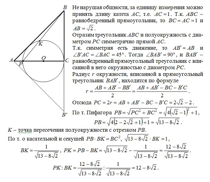 На катете AC равнобедренного прямоугольного треугольника ABC выбрана точка P так, что полуокружность, построенная на отрезке PC как на диаметре, касается гипотенузы AB. В каком отношении полуокружность делит отрезок PB?