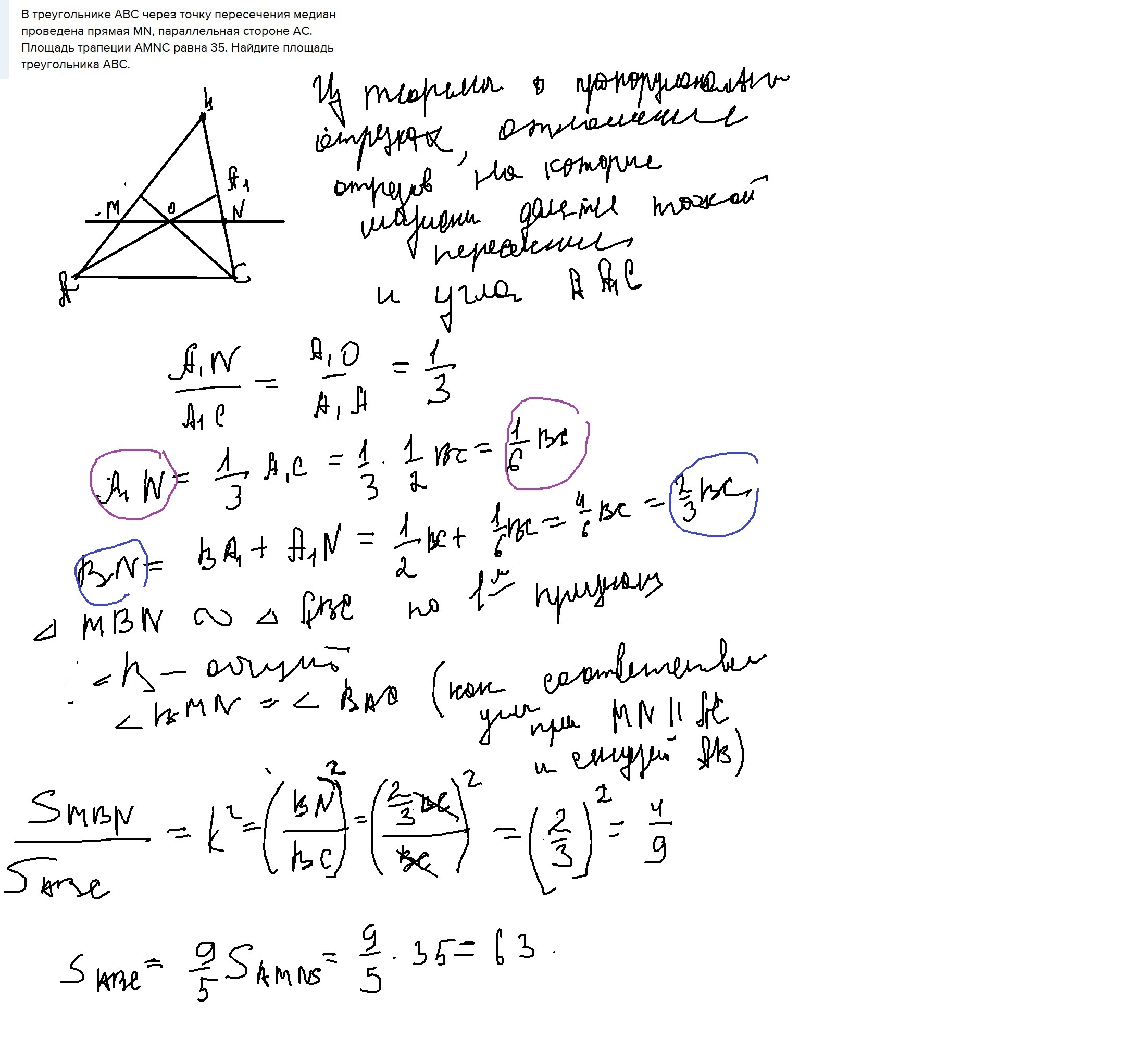 В треугольнике ABC через точку пересечения медиан проведена прямая MN, параллельная стороне AC. Площадь трапеции AMNC равна 35. Найдите площадь треугольника ABC.