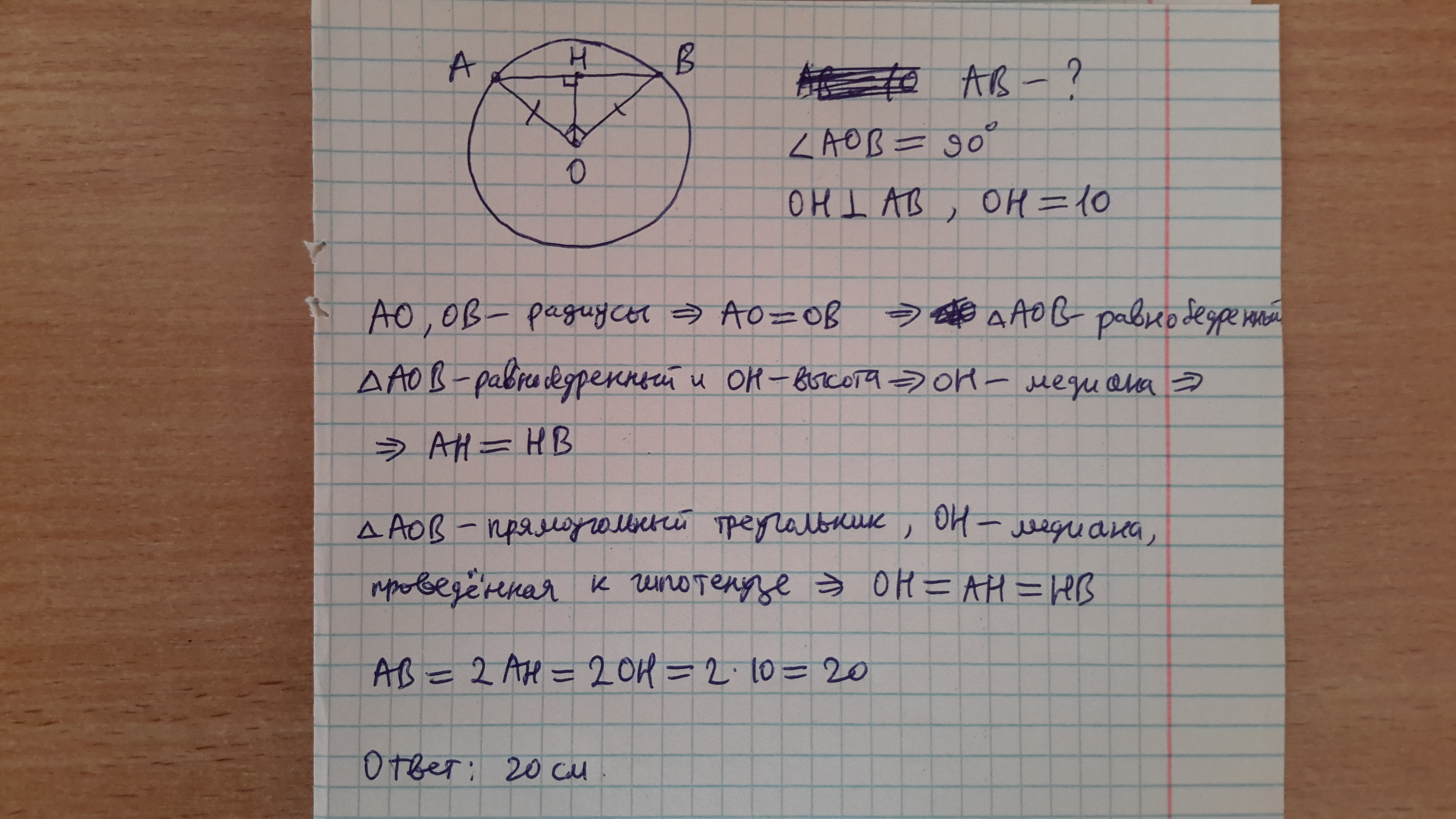 СРОЧНО !!!!! Расстояние от центра O до хорды AB - 10 см .Проведённые на концы хорды радиусы создают угол 90 градусов . Найдите длину хорды AB