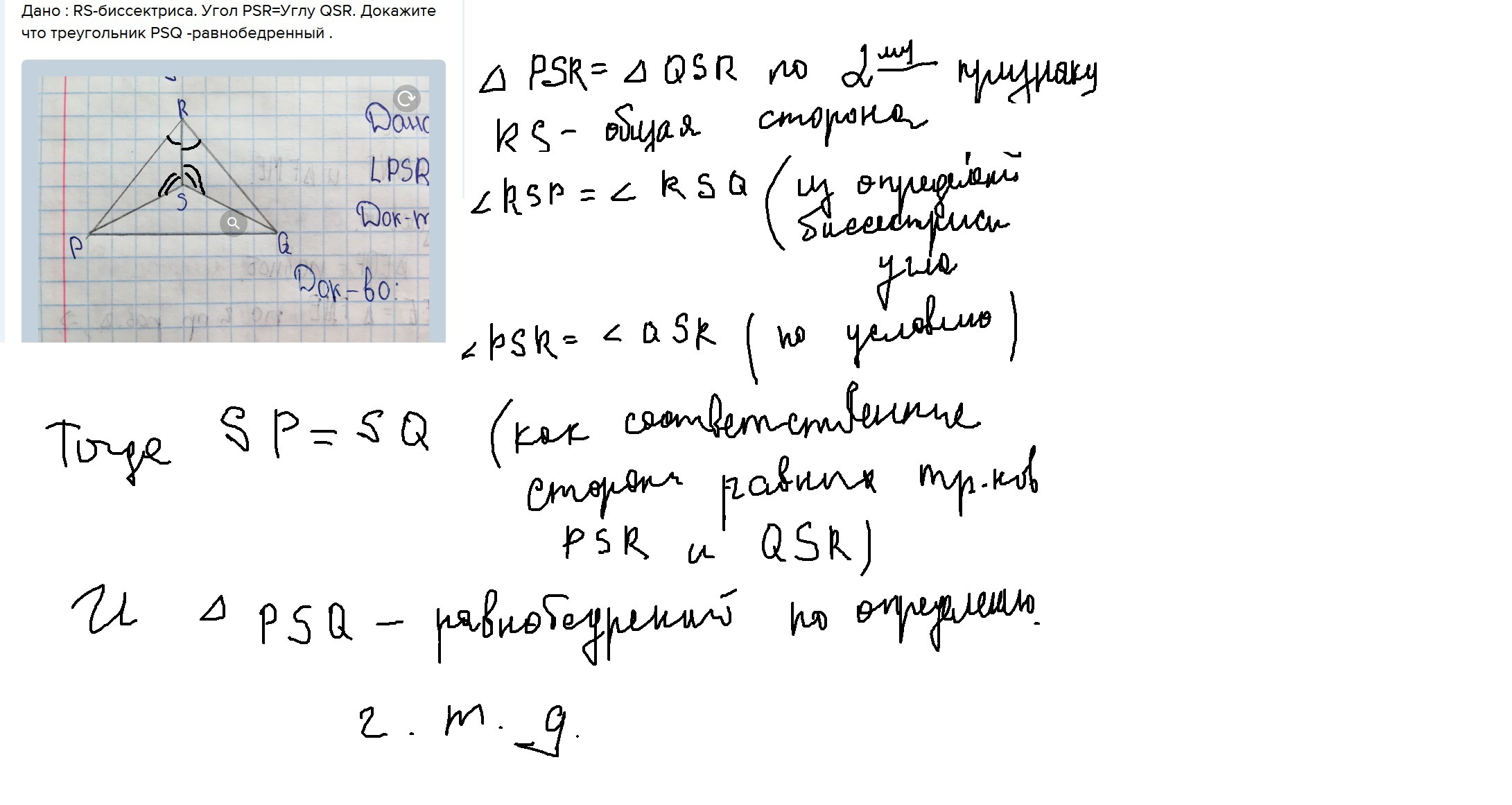 Дано : RS-биссектриса. Угол PSR=Углу QSR. Докажите что треугольник PSQ -равнобедренный .