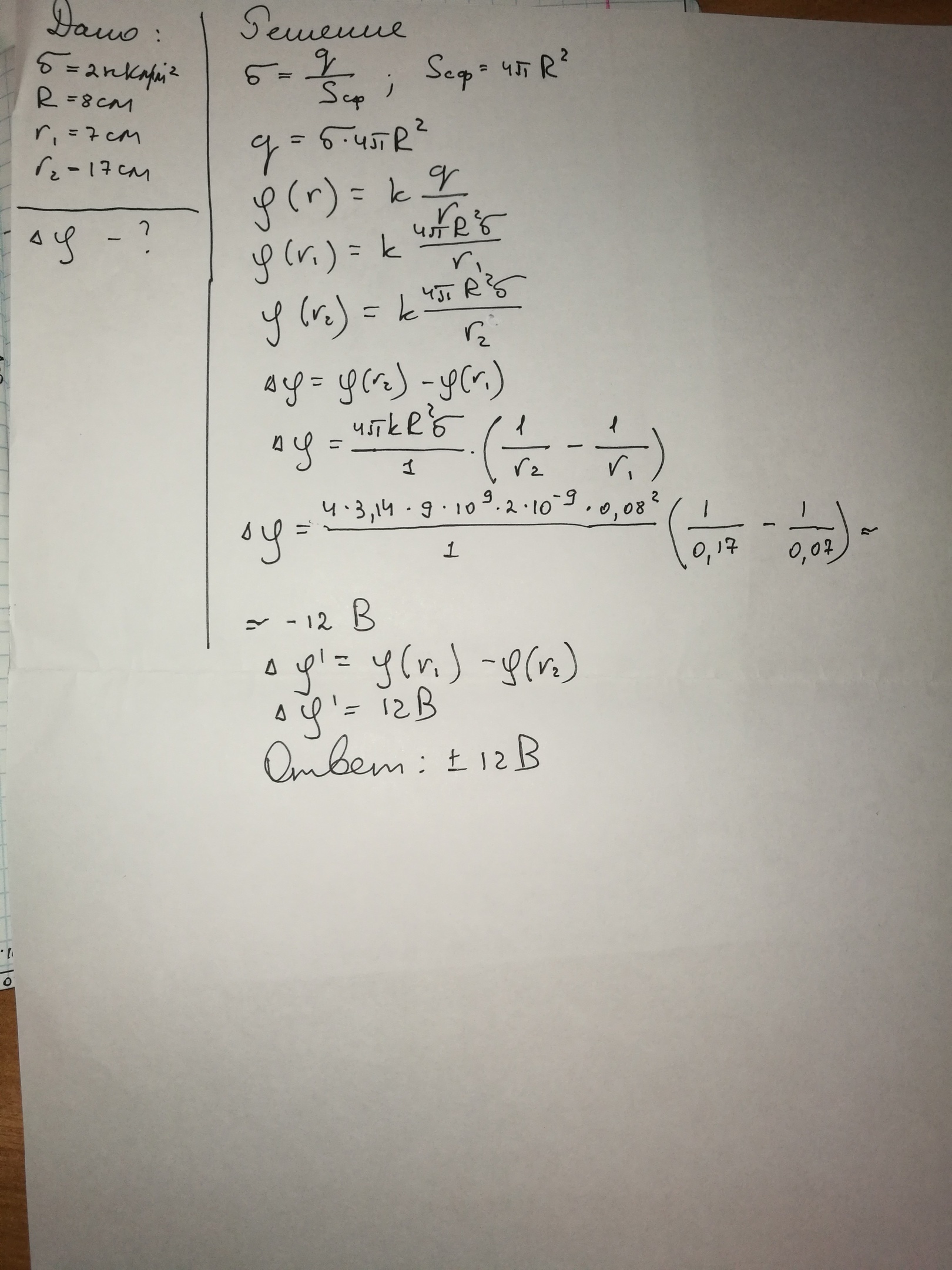 Там знак ответа зависит от того потенциал какой точки вычитаем из другой, так как потенциал убывает при удалении от центра сферы