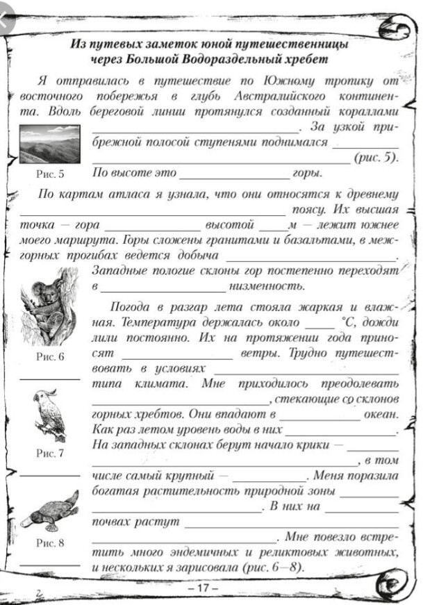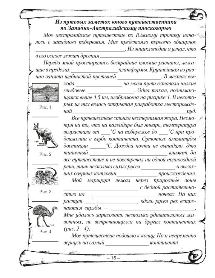 (рис1- горы, рис2-кенгуру, рис3-плащеносная ящерица, рис4-страус)