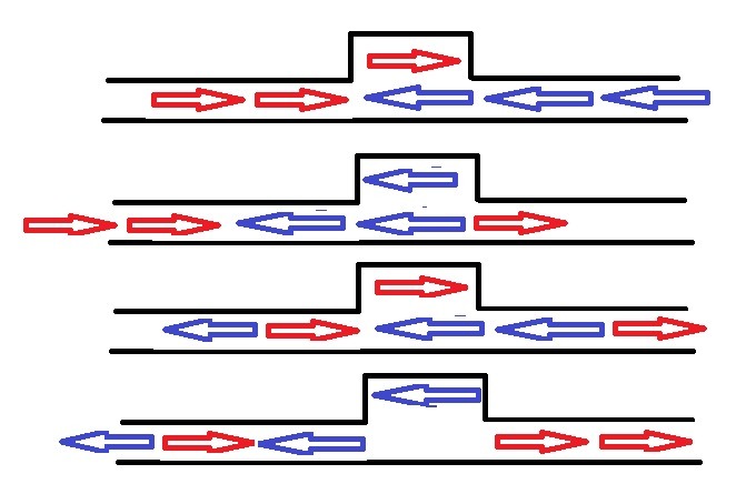 Алгоритм движения на рисунке в приложении - один заходит в шлюз, а остальные проходят мимо него, Затем в обратную сторону.