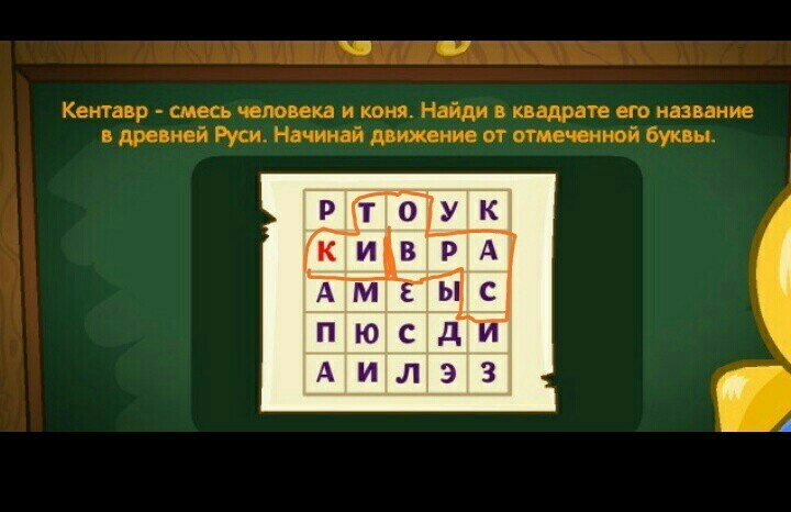 Кентавр - смесь человека и коня. Найди в квадрате его название в древней Руси. Начиная движение от отмеченной буквы.