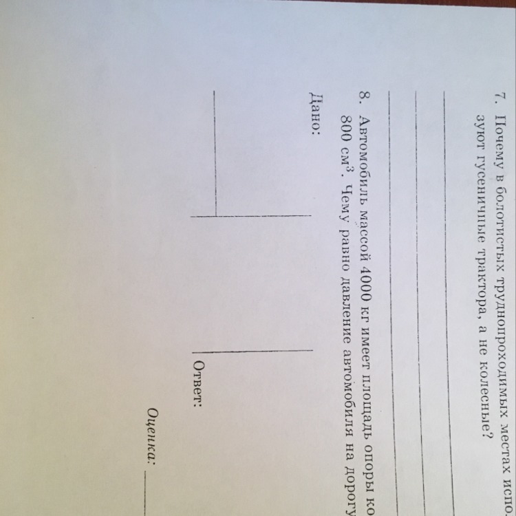 Автомобиль массой 4000 кг имеет площадь опоры колёс 800 см 3. Чему равно давление автомобиля на дорогу???????????