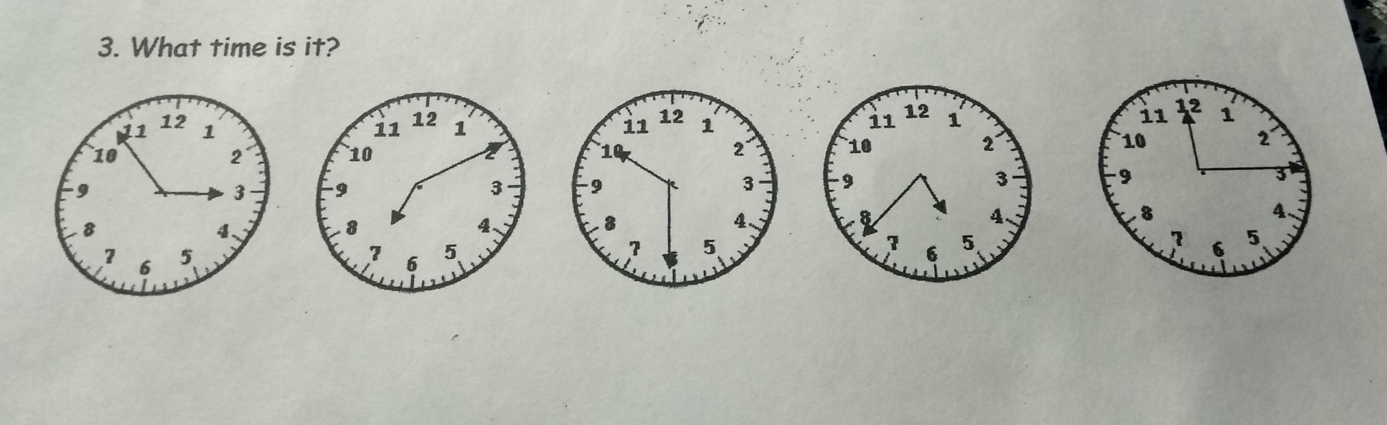 It's five minute to three. It's ten minute past seven. It's ten minute to six. It's twenty minute to six. It's three o'clock.