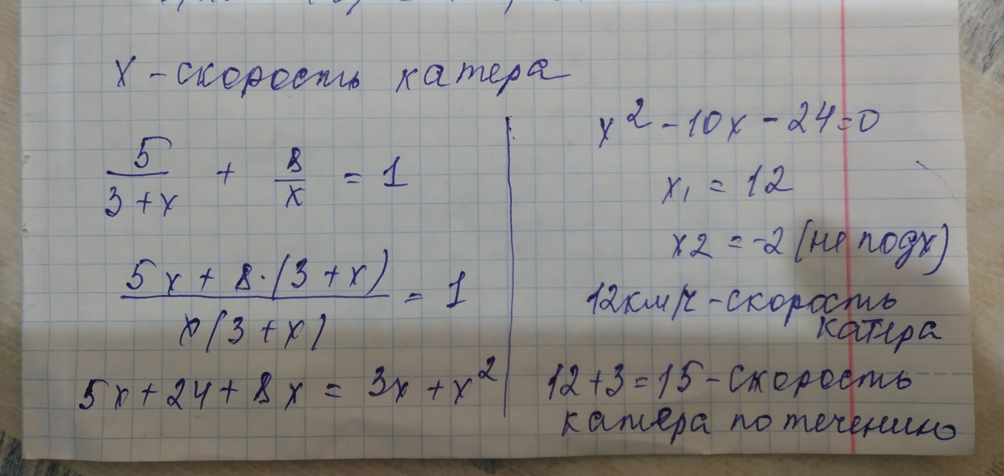 Катер прошел 5 км по течению реки и 8 км по озеру, затратив на весь путь один час. Скорость течения реки равна 3 км в час. Найдите скорость катера по течению.