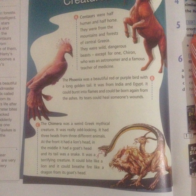Химера была странным греческим мифическим существом. Она действительно странно выглядела. У неё было три головы трёх разных животных. В начале у неё была голова льва, в середине голова козла и хвостом была змея. Она была жутким созданием. Она могла драться как лев или дышать огнем как дракон из головы козла.
