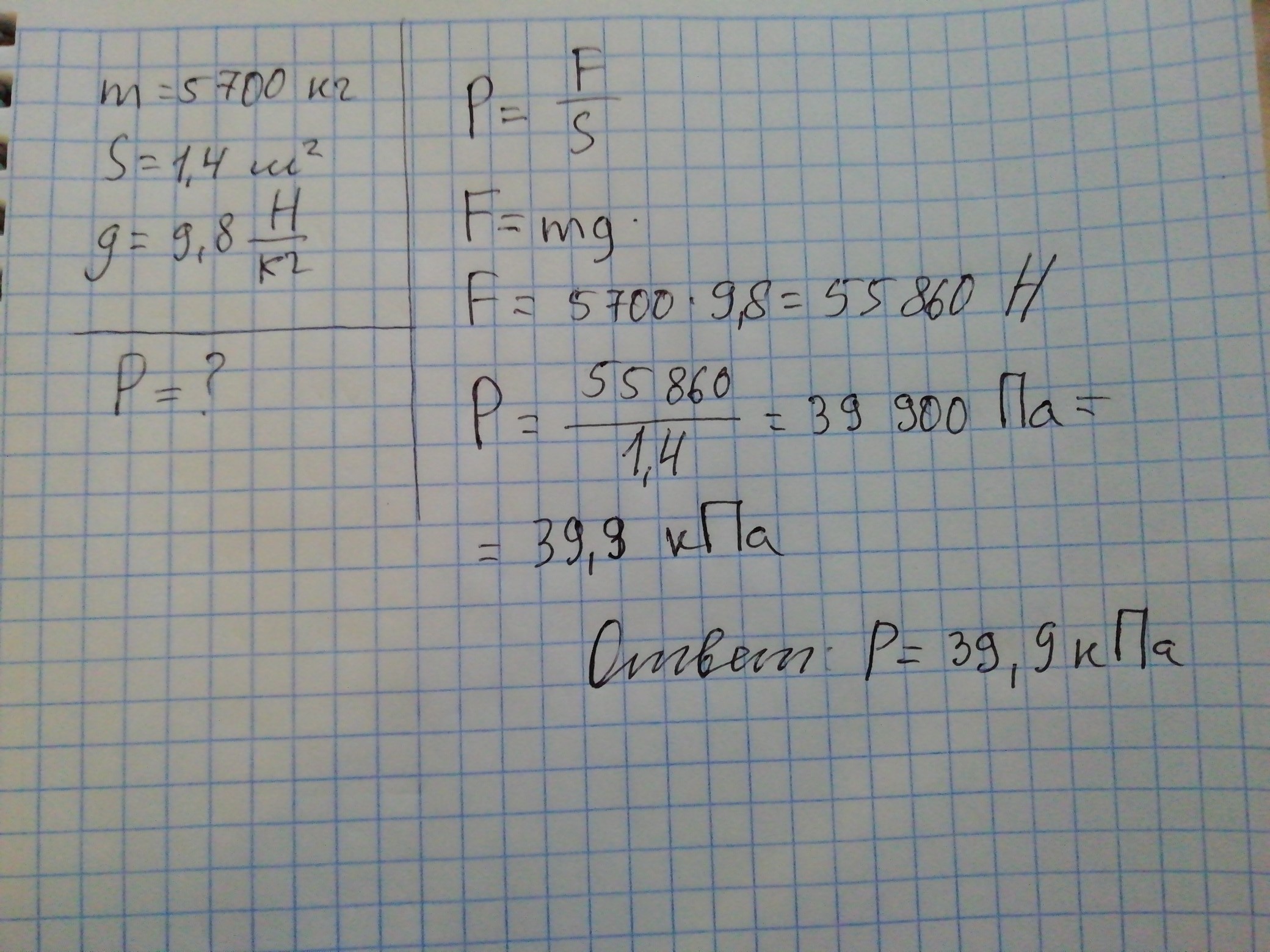 Гусеничный трактор массой 5700 кг имеет опорную площадь обеих гусениц 1,4 м2. Определи давление этого трактора на почву. Принять g=9,8Н/кг.