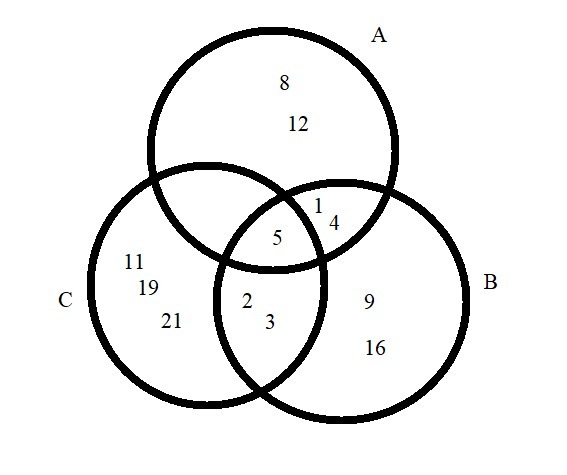 Изображите при помощи диаграммы елера вена множество а=1,4,5,8,12,в=1,2,3,4,5,9,16.с=2,3,5,11,19,21,