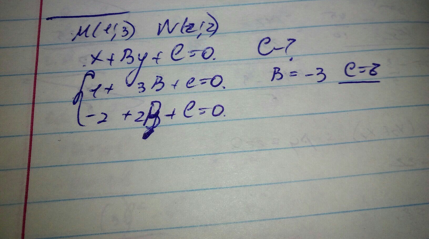Общее уравнение прямой,проходящей на плоскости через точки M(1;3) и N (-2;2), имеет вид x+By+C=0 найти коэффициент C