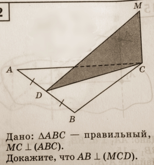 У тебя MC перпендикулярно (ABC), сл-но MC перпендикулярно AB. Также, так как ABC - правильный, то CD не только медиана, но и высота, сл-но CD перпендикулярно AB. Откуда по теореме о трех перпендикулярах MD также перпендикулярна плоскости (ABC), сл-но (MDC) перпендикулярна (ABC), соотв. AB перпендикулярна (MDC)