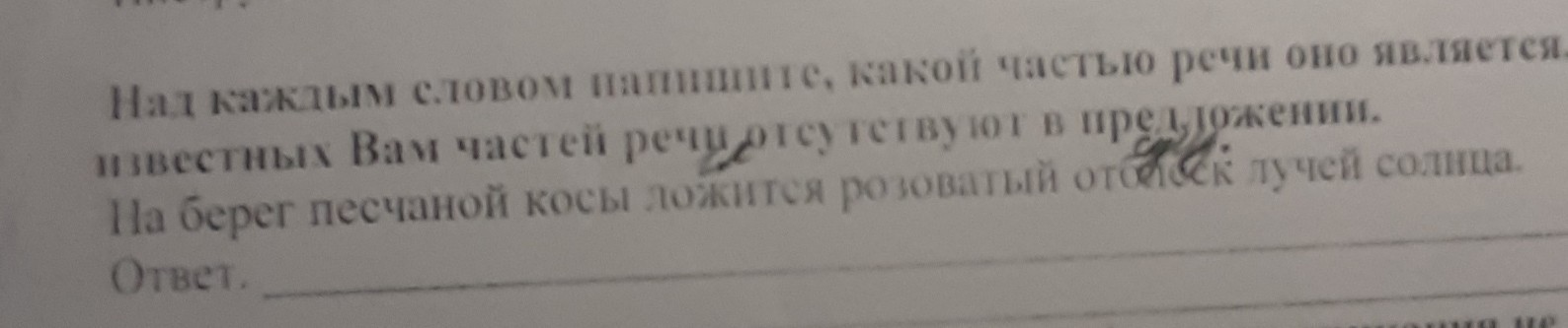 Не(пр-предлог) берег(сущ) песчаный (прилагательное) ложится (глагол) розовый (прилагательное) отблеск лучей(дополнение) солнца (сущ)