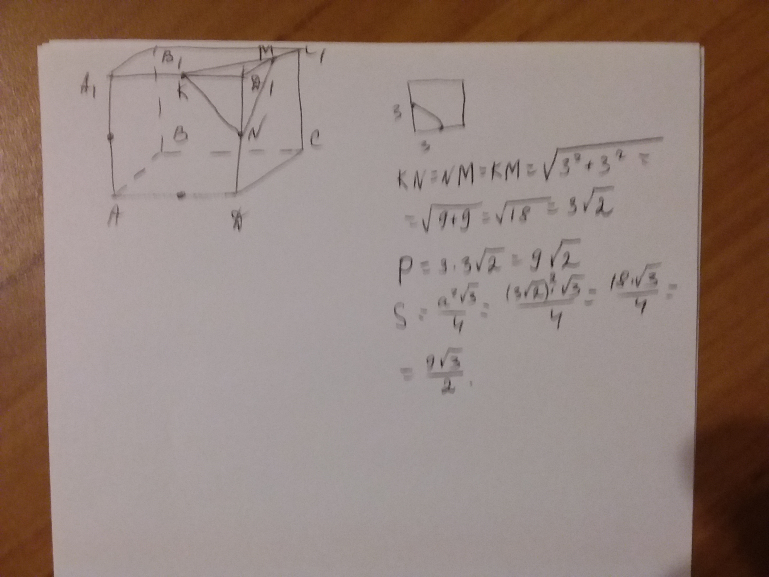 .Через середину трьох ребер куба, які виходять із однієї вершини, проведено переріз. Обчисліть периметр і площу перерізу, якщо ребро куба дорівнює 6 см.