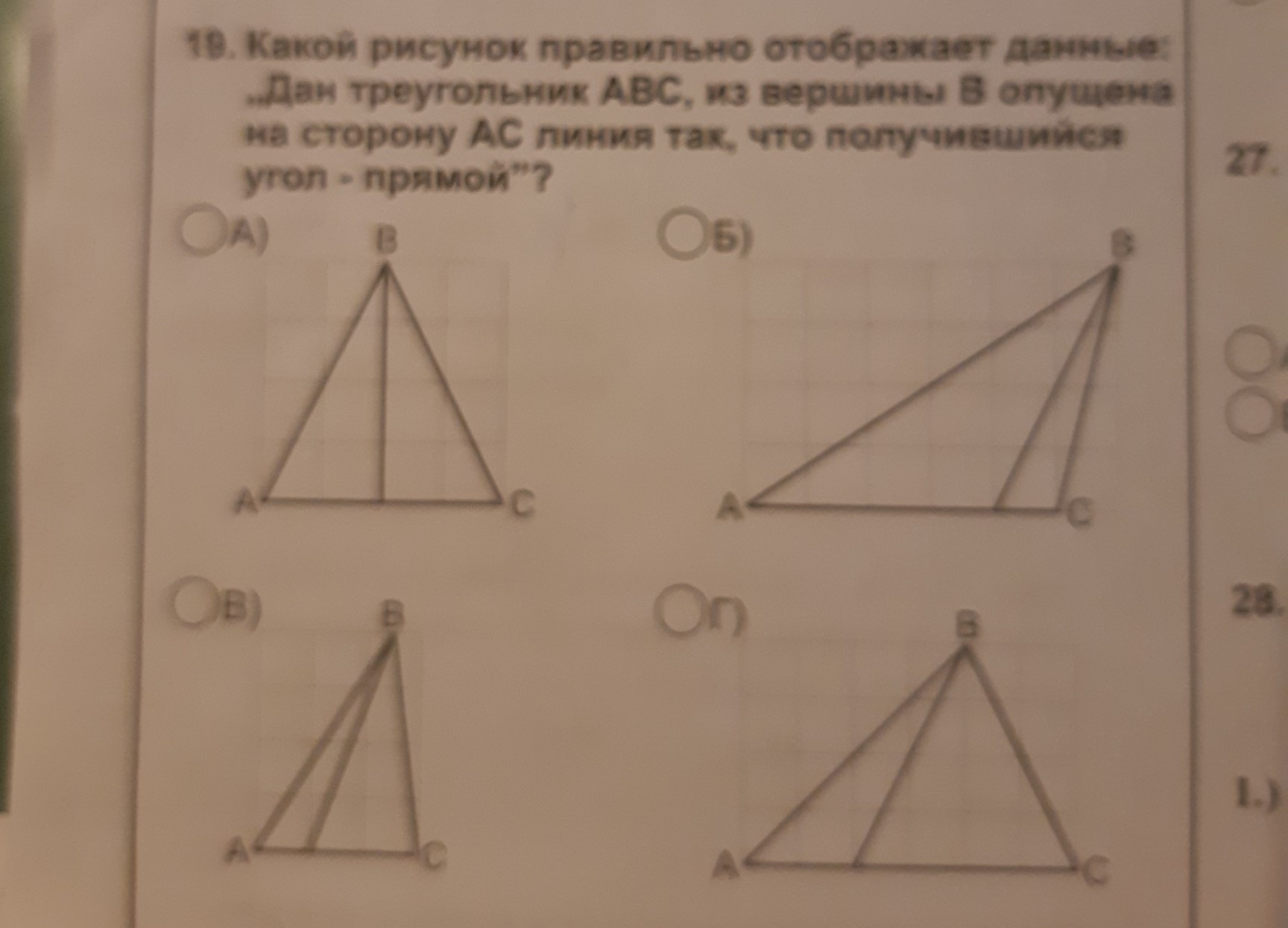 на рисунках Б,В,Г. линии, опущенные из точки В к стороне АС, образует один острый и другой тупой углы .А на рисунке А линия,опущенная из точки В к стороне АС , образует два прямых угла.