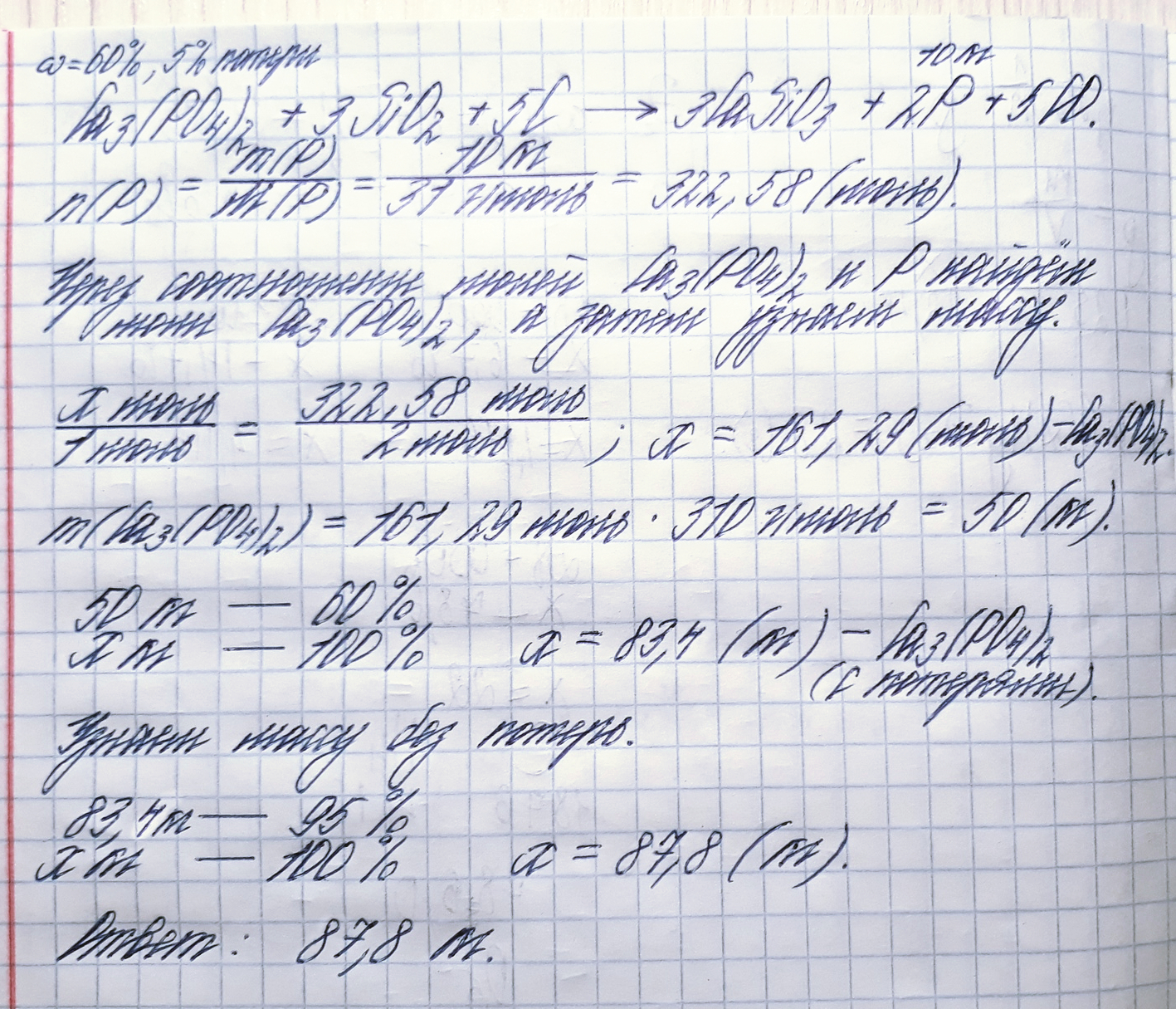 Сколько потребуется фосфорита, содержащего 60% Ca3(PO4)2, для получения 10 кг фосфора, если потери фосфата кальция составляют 5%? Ответ: 87,8 кг.
