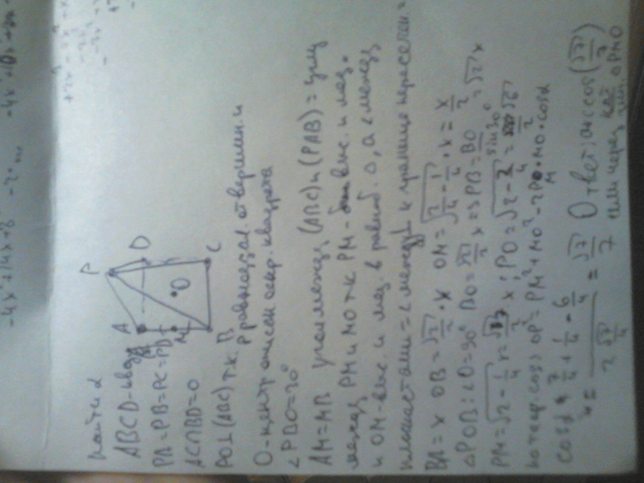 Точка P равноотдалённая от всех вершин квадрата ABCD.Угол между прямой PB и ABC 30°.Найдите угол между площинами ABC и PAB