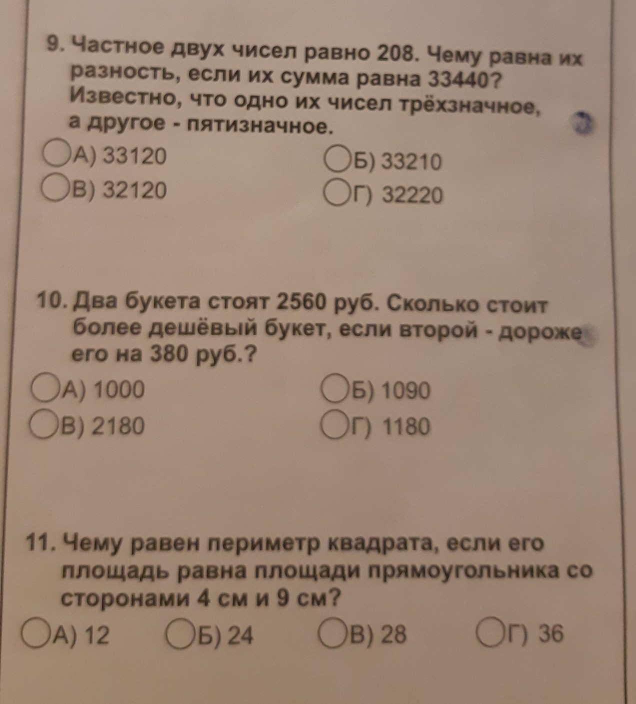 1) a/b = 208; a + b = 33440;; a = 208b; 208b + b = 33440; b = 160; a = 208 · 160 = 33280; 2)( 2560 - 380 ) : 2 = 1090; Ответ: 1090; 3) S = 4 · 9 = 36 см² ⇒ так как стороны квадрата равны, а площадь его 36 см², то сторона квадрата равна 6 см ⇒ P = 6 · 4 = 24 см; Ответ: 24 см