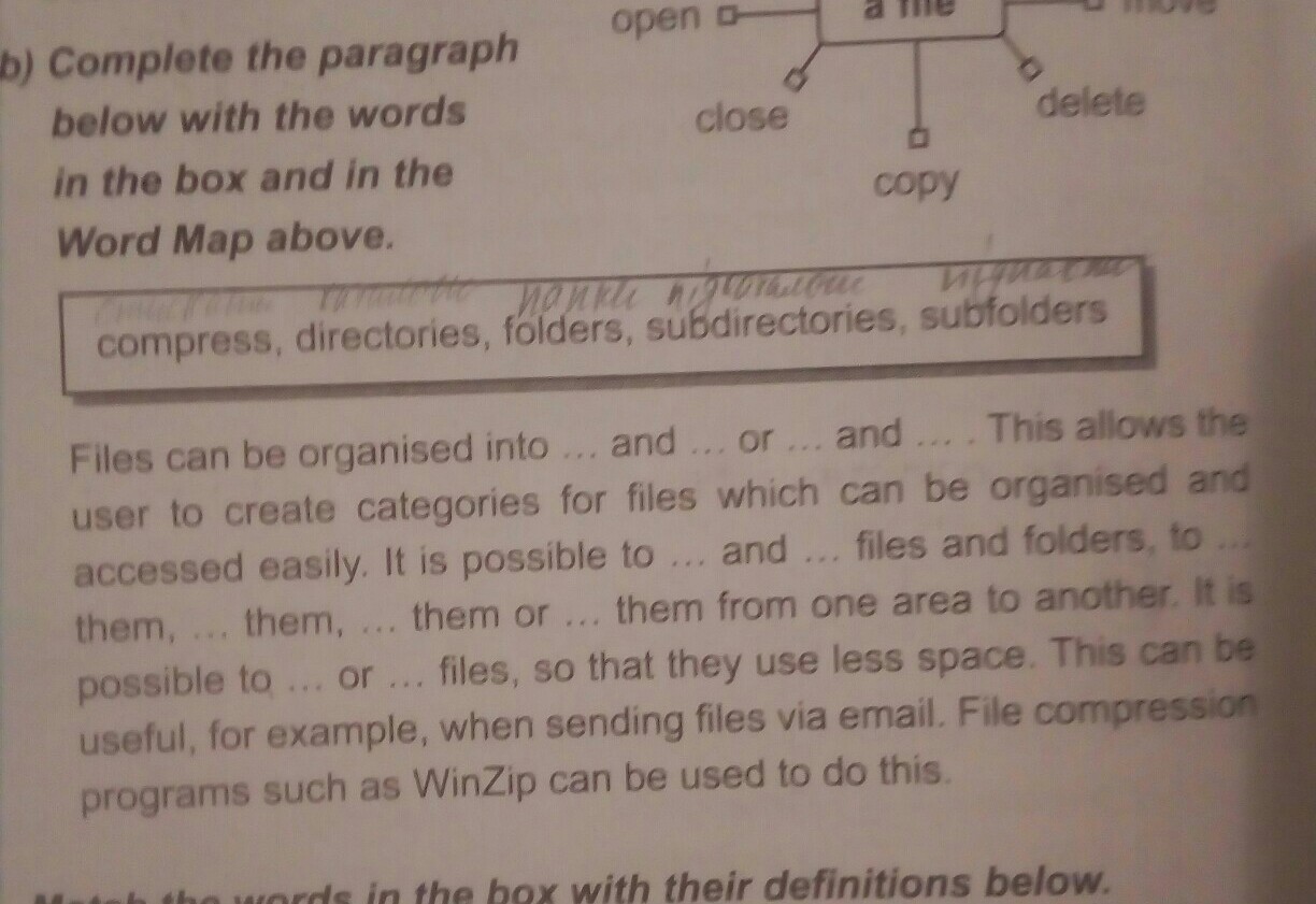 Files can be organized into subfolders and subdirectories or folders and directories. This allows the user to create categories for files which can be organized and accessed easily. It is possible to create and open files and folders, to save them, rename them, move them or copy them from one area to another. It is possible to compress or delete files, so that they use less space. This can be useful, for example, when sending files via e-mail. File compression programs such as WinZip can be used to do this.