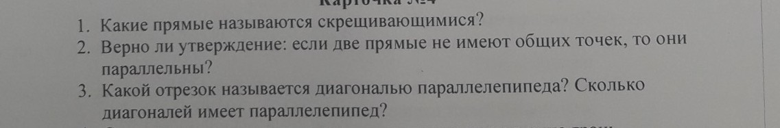 1. Скрещивающиеся прямые — прямые, которые не лежат в одной плоскости.