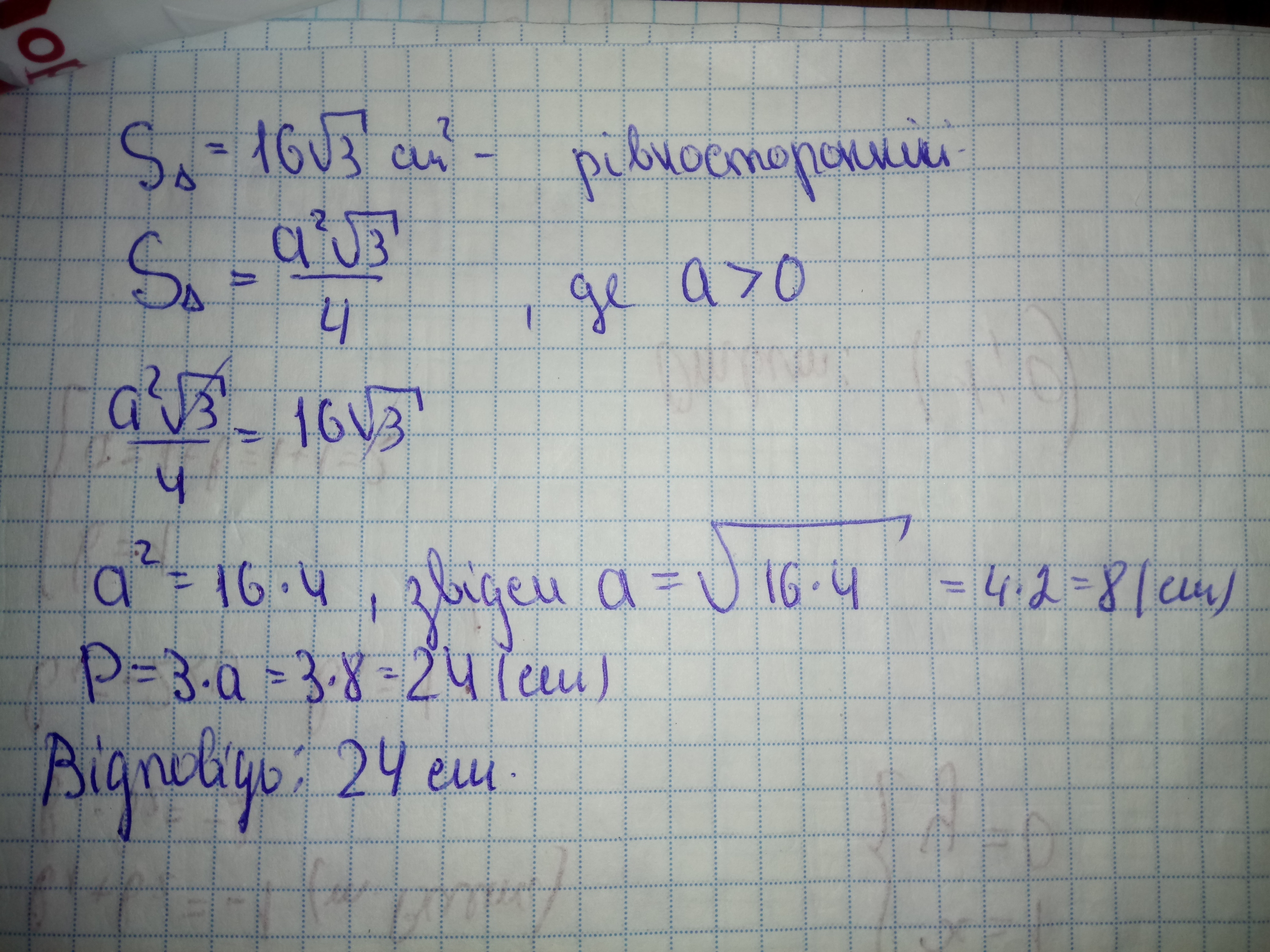 Розв'язання завдання додаю. 9 клас. Треба знати та використовувати формулу площi рiвностороннього трикутника.