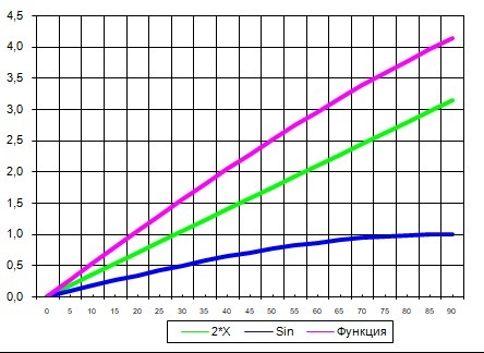 1. Функция состоит из двух частей - прямая - y =2*x и тригонометрическая - sinx.