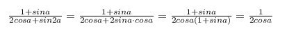 1). sin2a=2sinacosa(формула двойного угла )-во 2 уровне в знаменателе( формула там написана). 2). в 3 уровне выносим за скобки общий множитель за скобки (2 cosa). 3). производим сокращение.