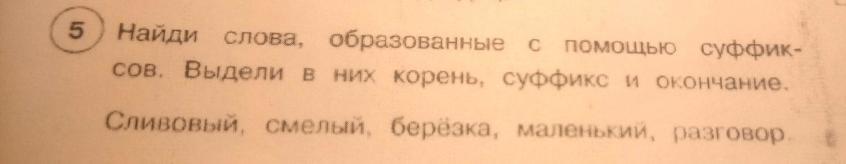 Сливовый корень-слив, ов-суффикс и ый-окончание; берёзка корень-берёз, к-суффикс и а-окончание; маленький мал-корень, еньк-суффикс и ий-окончание.