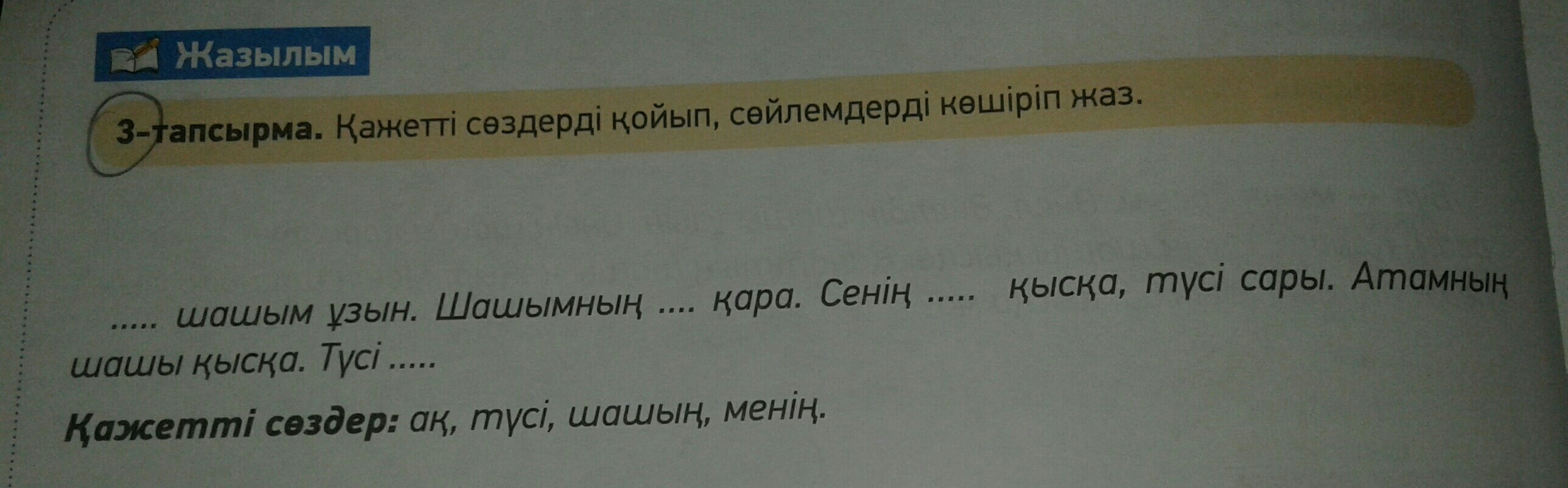 Менің шашым ұзын. Шашымның түсі қара. Сенің шашың қысқа, түсі сары. Атамның шашы қысқа.Түсі ақ.
