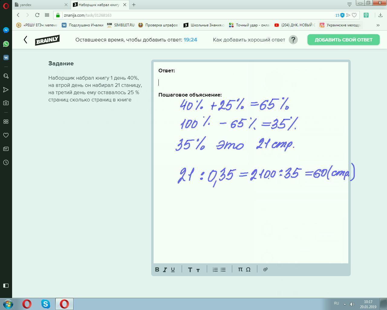 Наборщик набрал книгу 1 день 40%, на втрой день он набирал 21 станицу, на третий день ему оставалось 25 % страниц сколько страниц в книге