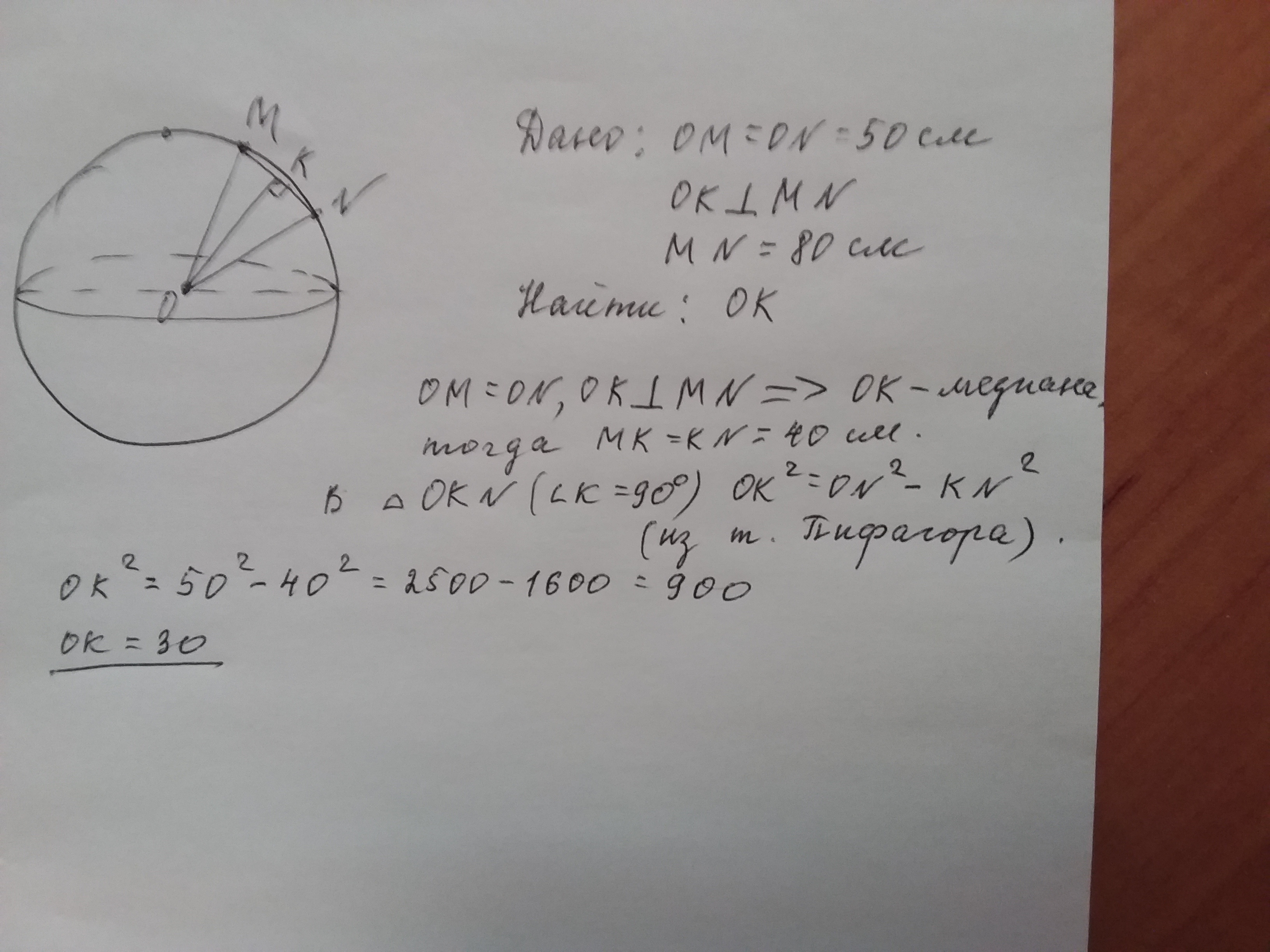 25 баллов за решение. Точки М и N лежат на поверхности шара радиусом 50 см. Найдите расстояние от центра шара до отрезка МN, если длина этого отрезка 80 см. С дано и чертежом, заранее спасибо
