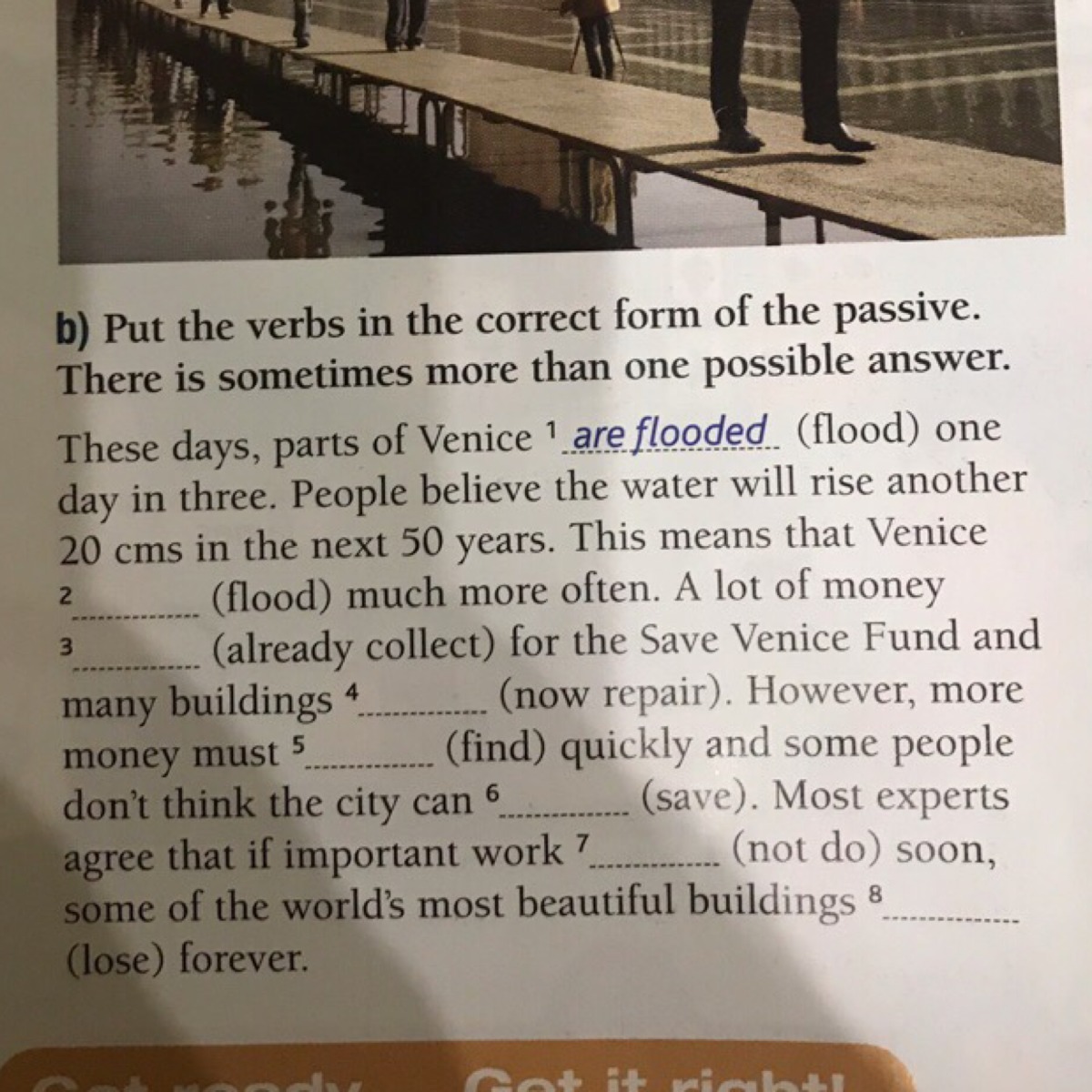 will be flooded, have been already collected, are now repaired, be found, be saved, won't be done, will be lost.