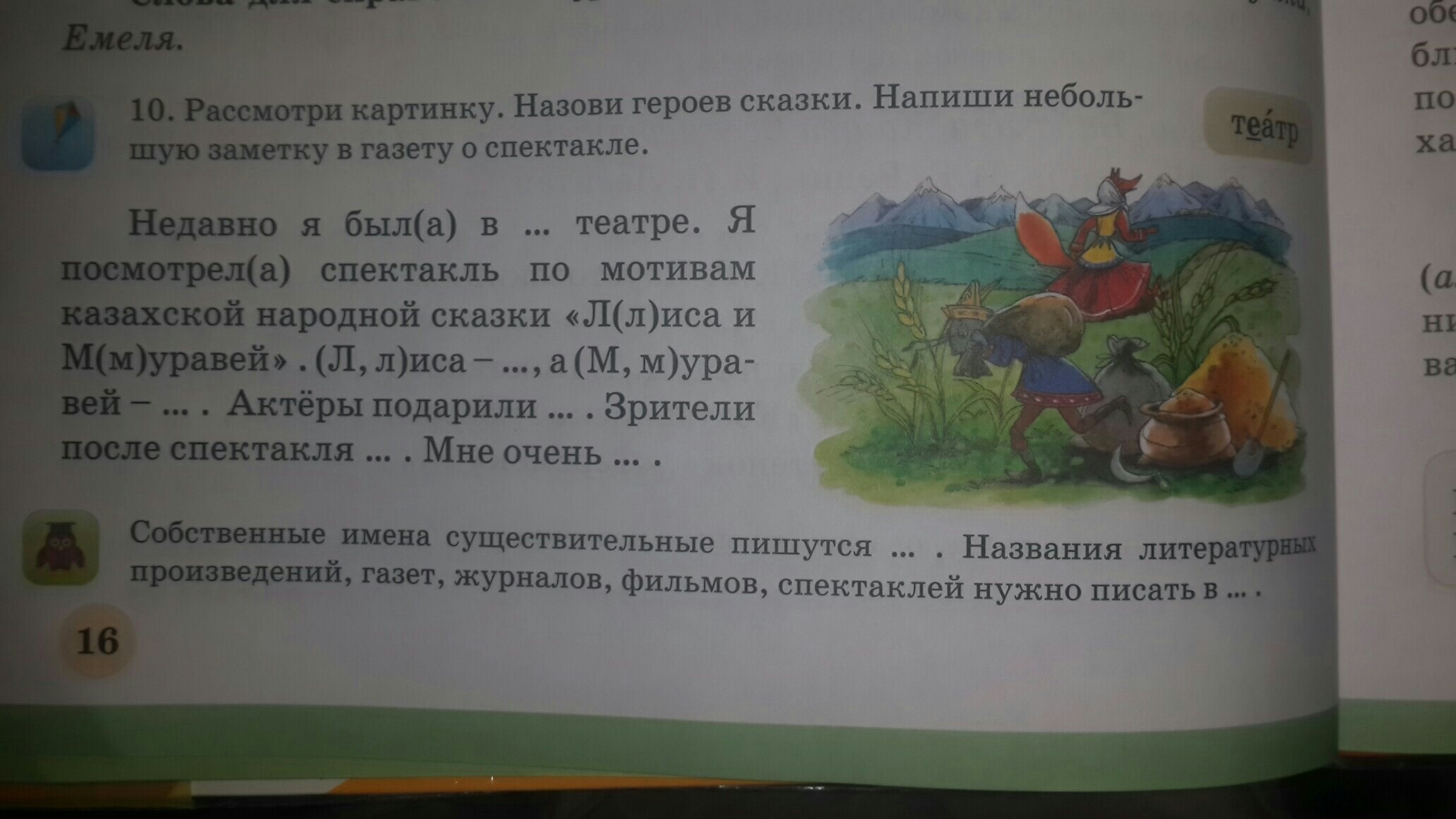 Недавно я была в прекрасном театре. Я посмотрела спектакль по мотивам казахской народной сказки «Лиса и Муравей».Лиса-была самовлюблённая, а Муравей-трудолюбивый. Актёры подарили всем детям конфеты. Зрители после спектакля были в восторге от такой хороший игры. Мне очень понравилось