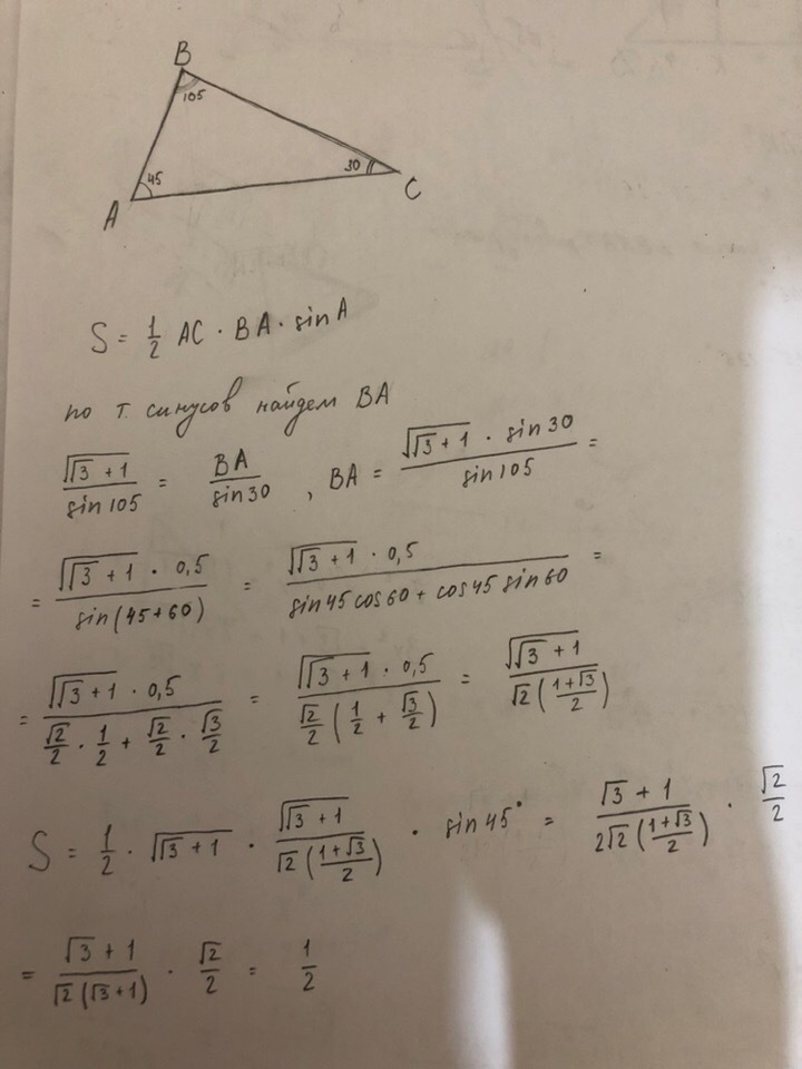 Найти площадь треугольника,если его сторона равна корень умножить на корень из 3 и +1под первым корнем,а углы,прилежащей к это стороне равны 45 и 30.