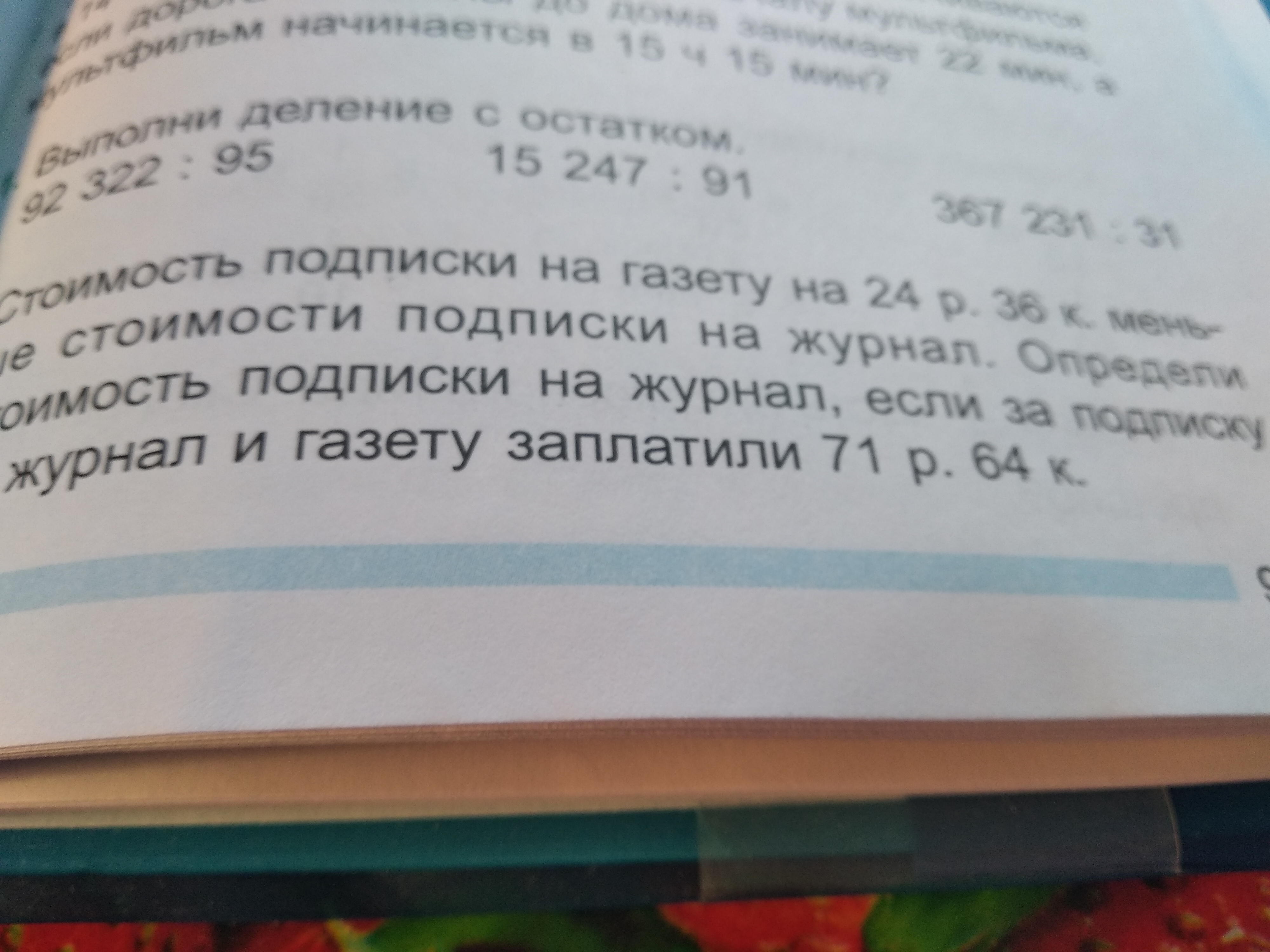 1) 71,64 - 24,36 = 47,28 руб стоимость на газету и журнал поровну