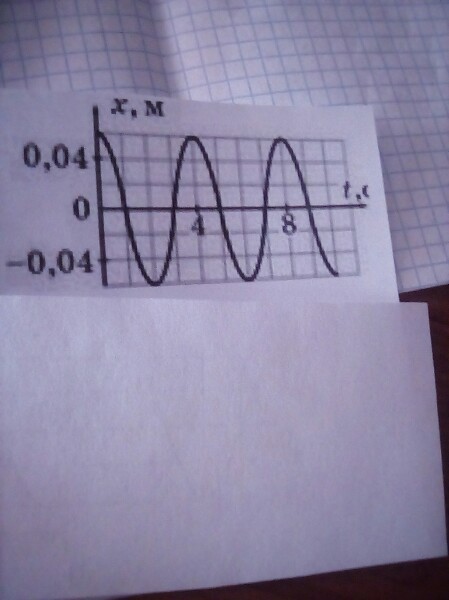 Амплитуда - это наибольшее по модулю значение х на графике, то есть 0,06. Период - время, за которое полностью повторяется колебание, то есть 4 с. Частота равна 1 делить на период, то есть 0,25 Гц.