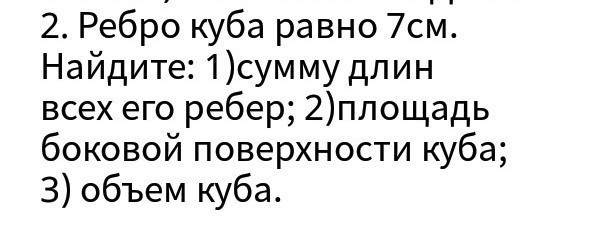 У куба 12 ребер 12*7=84см, S бок=6*7*7=294 см^2 V =a*a*a=7^3=343