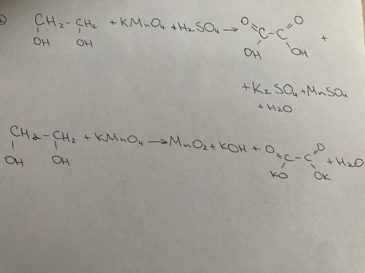 1. 5CH2(OH)-CH2(OH) + 8KMnO4 + 12H2SO4 = 5(HOO)C-C(OOH) + 4K2SO4 + 8MnSO4 + 22H2O