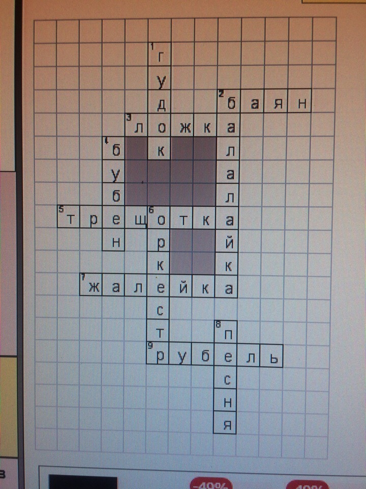 5. Русский народный ударный музыкальный инструмент, состоящий из тонких дощечек, соединённых между собой плотной верёвкой, продетой в отверстия верхней части дощечек. Издает звук, похожий на треск.