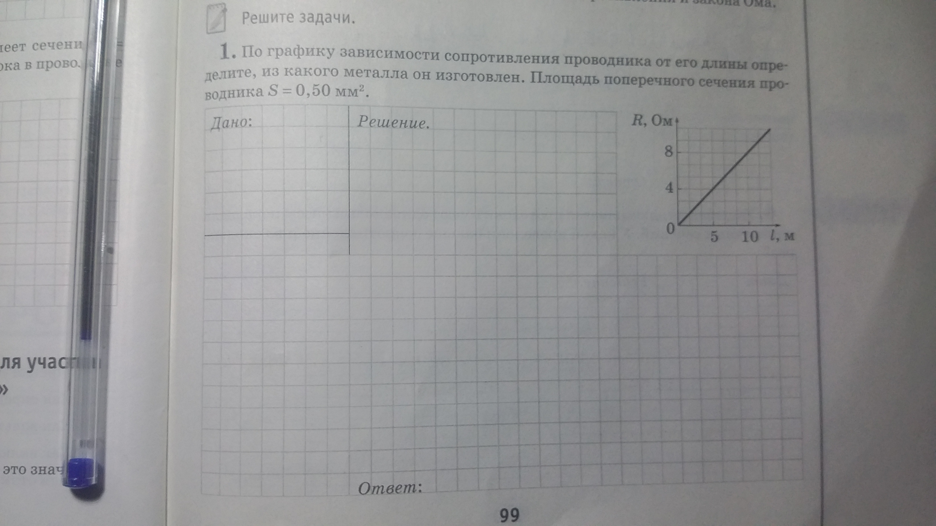 По графику зависемости сопротивления проводника от его длины определите ,из кокого металла он изготовлен. Площать поперечного сечения проводника S = 0,50мм2