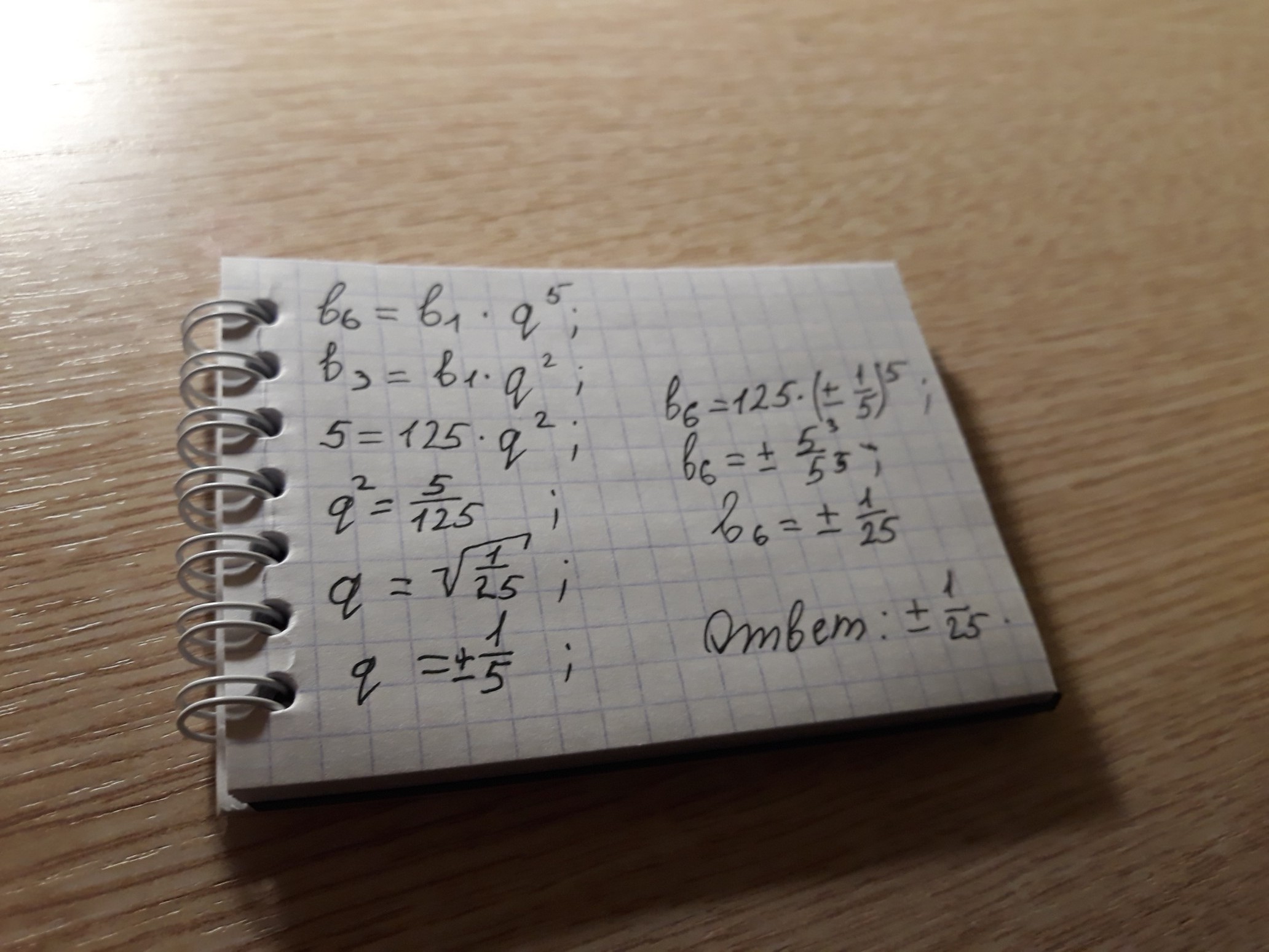 q₂=-1/5 b₆=b₁*q⁵=125*(-1/5)⁵=5³/(-5⁵)=-5⁽³⁻⁵⁾=-5⁻²=-(1/25).