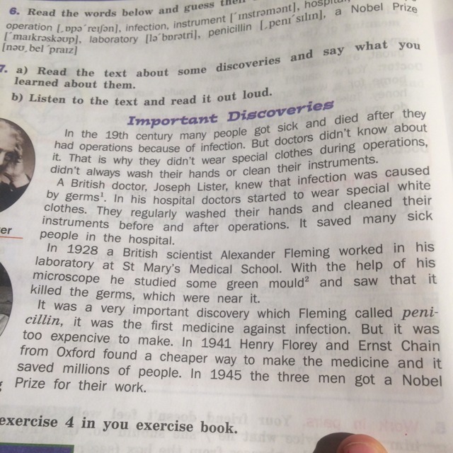 Британский доктор, Жозеф Листер, знал, что инфекцию вызывают микроорганизмы. В его больнице доктора стали носить специальную белую одежду. Они регулярно мыли руки и очищали инструменты до и после операций. Это спасло многих больных людей.