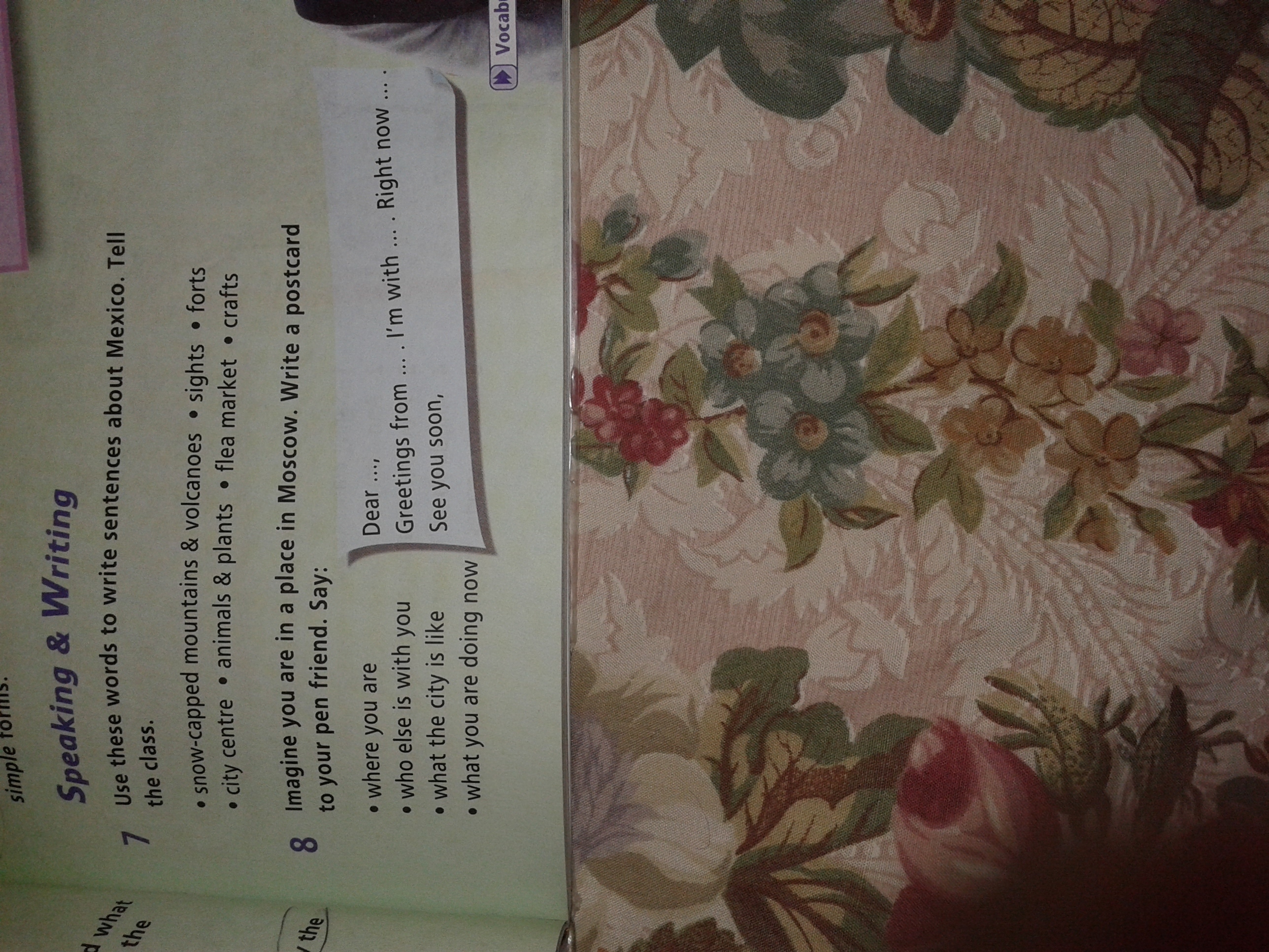 Greetings from Moscow. I'm with my parents there. This city is so big. There are lots of places to visit, for example the Red Square, VDNH and others. Right now I'm sitting in my room and writing the letter to you, then I'm going to eat.