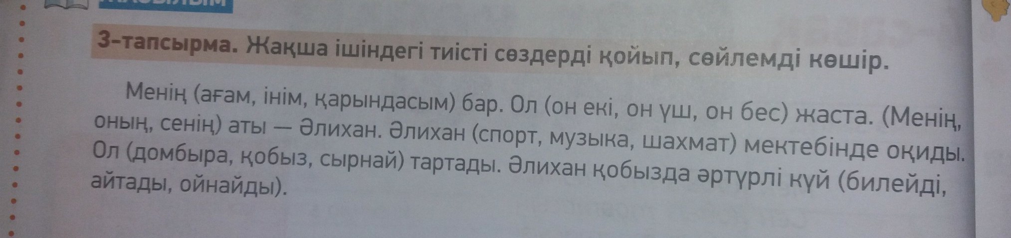Менин иним бар. Ол он еки жаста. Онын аты - Алихан. Алихан спорт мектебинде окиды. Ол кобыз тартады. Алихан кобызда артурли куй биледи.