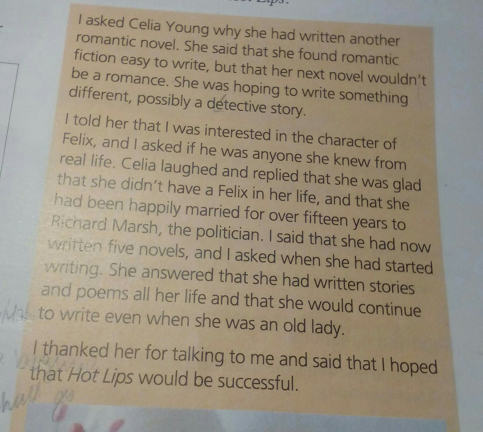 Я спросил Силию Янг, почему она написала еще один романтический роман. Она сказала, что ей легко написать романтическую беллетристику, но ее следующий роман не будет романом. Она надеялась написать что-то другое, возможно, детективную историю. Я сказал ей, что меня интересует персонаж Феликса, и я спросил, был ли он кем-то, кого она знала из реальной жизни. Селия рассмеялась и ответила, что она рада, что в ее жизни не было Феликса, и что она более пятнадцати лет была замужем за политиком Ричардом Маршем. Я сказал, что она написала пять романов, и спросил, когда она начала писать. Она ответила, что писала истории и стихи всю свою жизнь и что она будет продолжать писать, даже когда была старухой. Я поблагодарил ее за разговор со мной и сказал, что надеюсь, что Hot Lips будут успешными.